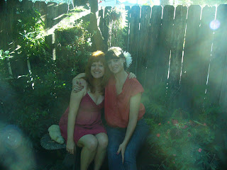 so, hubby has a pretty amazing (and pretty old) Panasonic camera with a Lumix lens. yeah baby. funny part about it is that all it takes is a quick tap of the finger to take a photo-but i'm talkin such a quick tap that no one understands/can tell that it is really all it takes, and so most everyone that grabs hold of said camera to shoot a photo ends up taking about 5 pictures instead of 1. case in point is seen below. these are images of my dear friend julie and i in my parent's cute backyard. i forget who took these photos, but obviously, they didn't realize the shutter going off at warp speed. what resulted was a mini photo session of almost-mirror images, as if it's one of those flip books you had when you were a kid, of an image that changed rapidly with each flick of a page. this is particularly hilarious with these images because of the corny images julie and i were purposely doing in order to fit in with the cottage/romantic vibe of the stone bench we were sitting on, in the quaint backyard. love it.